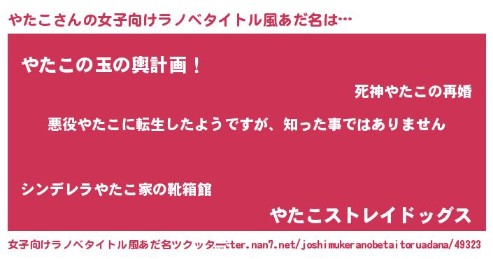 | 男性向けラノベタイトル風あだ名 | 『この素晴らしい世界にやたこを!』 |