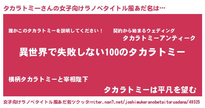 | 男性向けラノベタイトル風あだ名 | 『タカラトミーという概念が存在しない退屈な世界 』 |