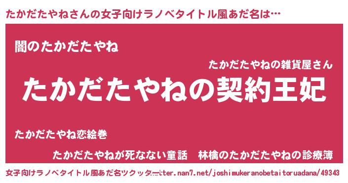 | 胡散臭い通販商品みたいなあだ名 | 『来世でも幸せになれる水素水…その名も「たかだたやね」』 |