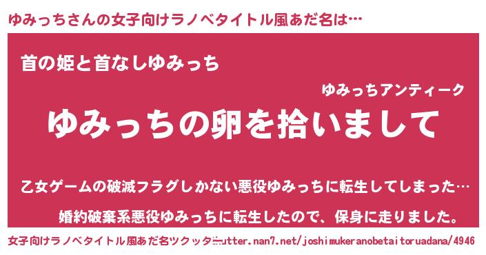 ゆみっちさんの女子向けラノベタイトル風あだ名は… 『ゆみっちの卵を拾いまして』『首の姫と首なしゆみっち』『婚約破棄系悪役ゆみっちに転生したので、保身に走りました。』 ツクッター #女子向けラノベタイトル風あだ名ツクッター http://tkutter.nan7.net/joshimukeranobetaitoruadana/4946/