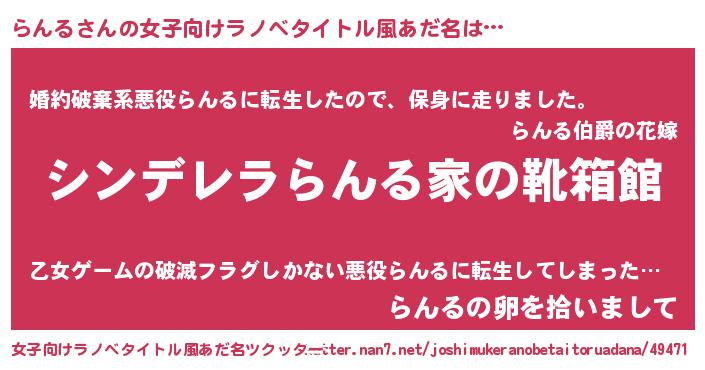 らんるさんの女子向けラノベタイトル風あだ名は… 『シンデレラらんる家の靴箱館』『婚約破棄系悪役らんるに転生したので、保身に走りました。』『らんるの卵を拾いまして』 ツクッター #女子向けラノベタイトル風あだ名ツクッター http://tkutter.nan7.net/joshimukeranobetaitoruadana/49471/