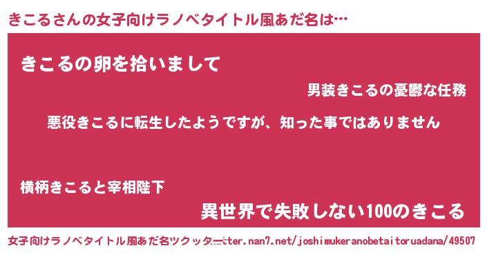 | 男性向けラノベタイトル風あだ名 | 『この素晴らしい世界にきこるを!』 |