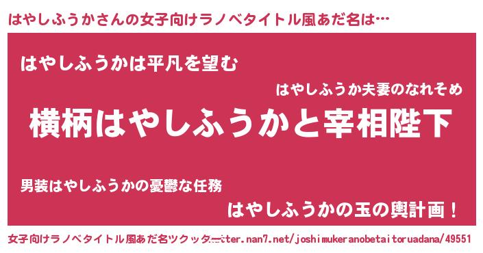 | 男性向けラノベタイトル風あだ名 | 『はやしふうかに滅ぼされるだけの簡単なお仕事です』 |