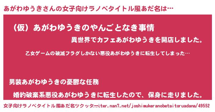 | 男性向けラノベタイトル風あだ名 | 『魔弾の王とあがわゆうき』 |