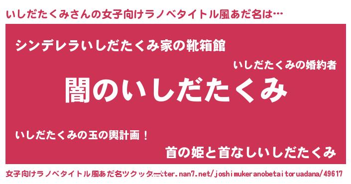 | 男性向けラノベタイトル風あだ名 | 『Re:いしだたくみから始める異世界生活』 |