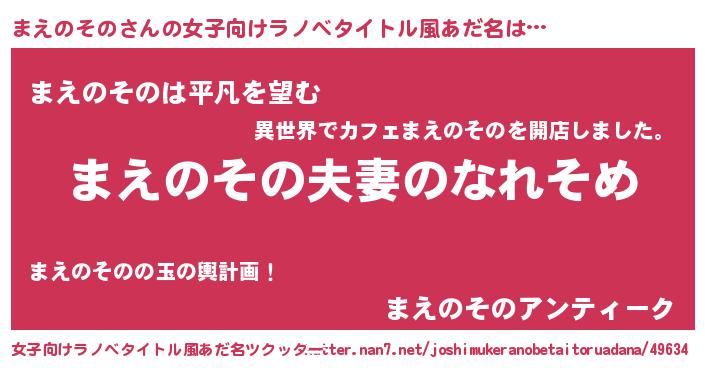 | 男性向けラノベタイトル風あだ名 | 『おまえをオタクにしてやるから、俺をまえのそのにしてくれ! 』 |