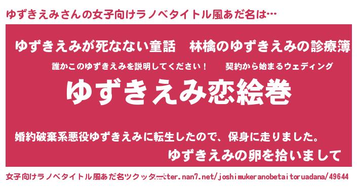| 男性向けラノベタイトル風あだ名 | 『おまえをオタクにしてやるから、俺をゆずきえみにしてくれ! 』 |