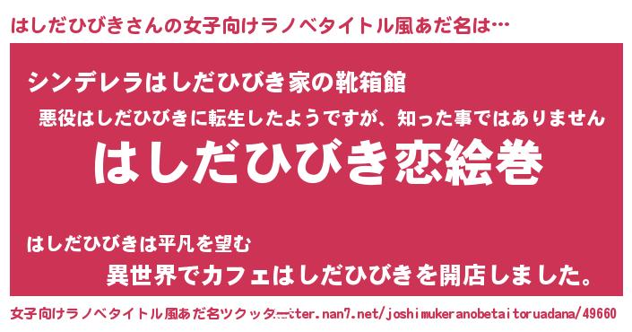 | 男性向けラノベタイトル風あだ名 | 『ノーゲーム・ノーハシダヒビキ』 |