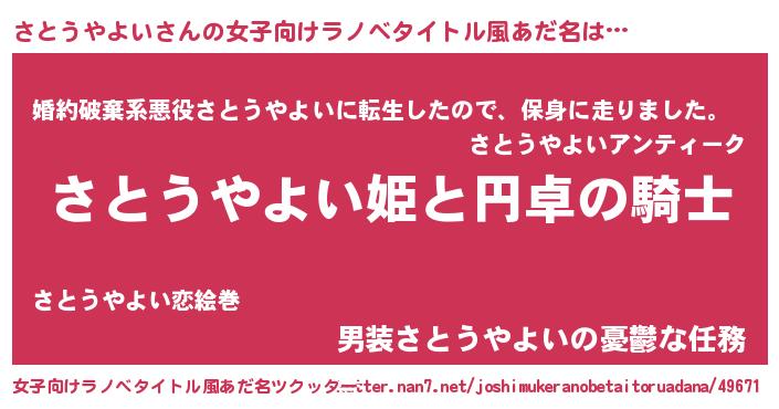 | 男性向けラノベタイトル風あだ名 | 『サトウヤヨイアートオンライン』 |