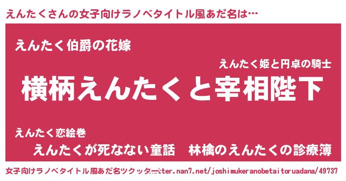 | 男性向けラノベタイトル風あだ名 | 『えんたくに滅ぼされるだけの簡単なお仕事です』 |