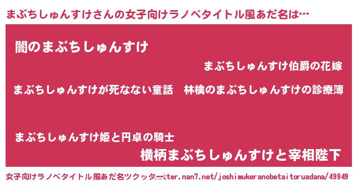 まぶちしゅんすけさんの女子向けラノベタイトル風あだ名は… 『まぶちしゅんすけが死なない童話 林檎のまぶちしゅんすけの診療簿』『闇のまぶちしゅんすけ』『横柄まぶちしゅんすけと宰相陛下』 ツクッター #女子向けラノベタイトル風あだ名ツクッター http://tkutter.nan7.net/joshimukeranobetaitoruadana/49949/