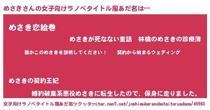 | 男性向けラノベタイトル風あだ名 | 『メサキアートオンライン』 |