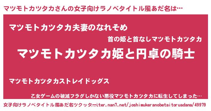 | 男性向けラノベタイトル風あだ名 | 『マツモトカツタカの憂鬱』 |