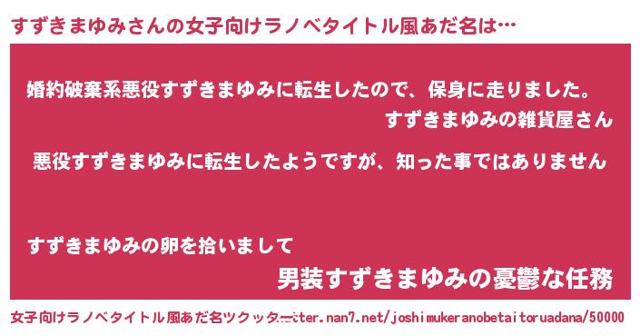 すずきまゆみさんの女子向けラノベタイトル風あだ名は… 『悪役すずきまゆみに転生したようですが、知った事ではありません』『婚約破棄系悪役すずきまゆみに転生したので、保身に走りました。』『男装すずきまゆみの憂鬱な任務』 ツクッター #女子向けラノベタイトル風あだ名ツクッター http://tkutter.nan7.net/joshimukeranobetaitoruadana/50000/