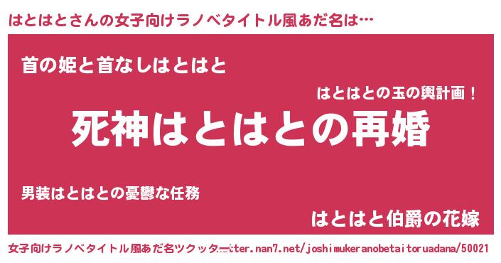 | 男性向けラノベタイトル風あだ名 | 『ノーゲーム・ノーハトハト』 |