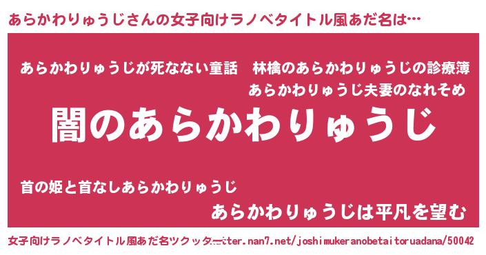 | 男性向けラノベタイトル風あだ名 | 『Re:あらかわりゅうじから始める異世界生活』 |