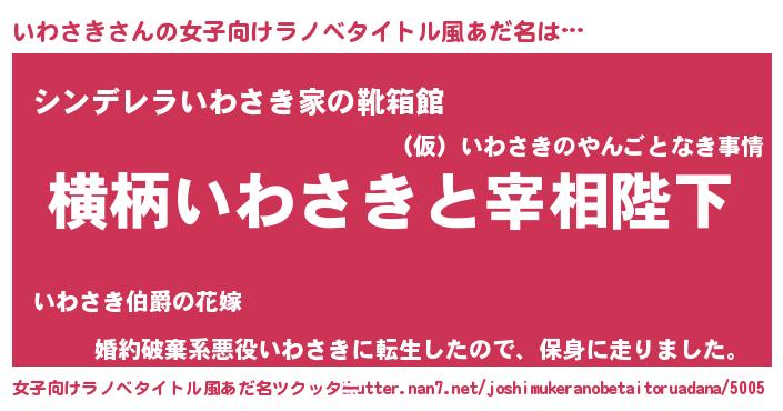 | 男性向けラノベタイトル風あだ名 | 『いわさきに滅ぼされるだけの簡単なお仕事です』 |