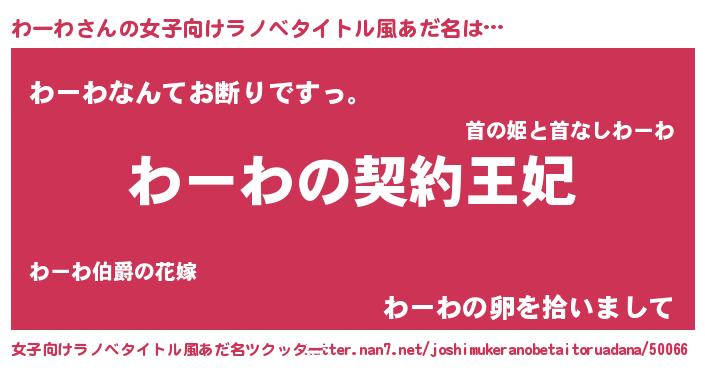 | 男性向けラノベタイトル風あだ名 | 『誰もが恐れるあのわーわが、ぼくの専属メイドになるようです。』 |