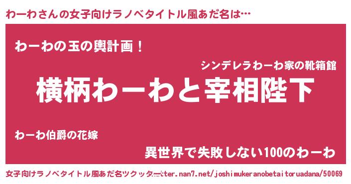 わーわさんの女子向けラノベタイトル風あだ名は… 『横柄わーわと宰相陛下』『わーわの玉の輿計画!』『異世界で失敗しない100のわーわ』 ツクッター #女子向けラノベタイトル風あだ名ツクッター http://tkutter.nan7.net/joshimukeranobetaitoruadana/50069/
