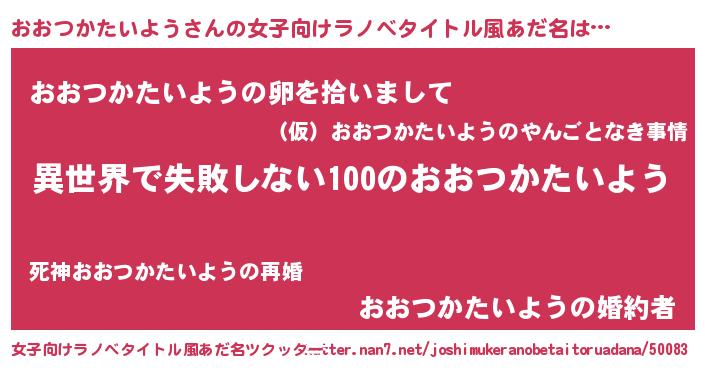 | 男性向けラノベタイトル風あだ名 | 『おおつかたいようという概念が存在しない退屈な世界 』 |