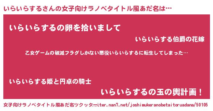 | 男性向けラノベタイトル風あだ名 | 『この素晴らしい世界にいらいらするを!』 |