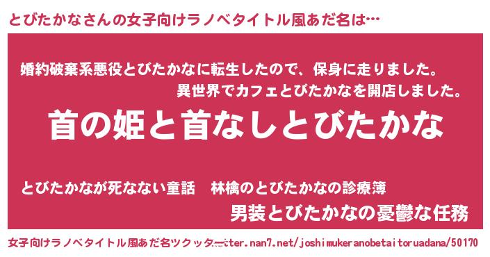 | 胡散臭い通販商品みたいなあだ名 | 『来世でも幸せになれる水素水…その名も「とびたかな」』 |
