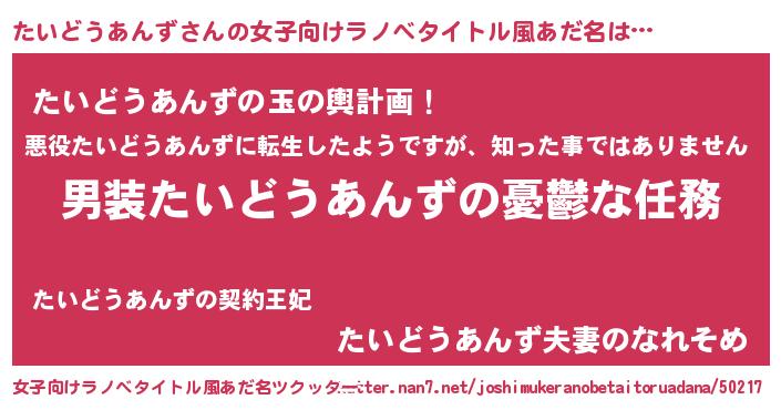 | 男性向けラノベタイトル風あだ名 | 『うちのたいどうあんずが世界を掌握している!』 |