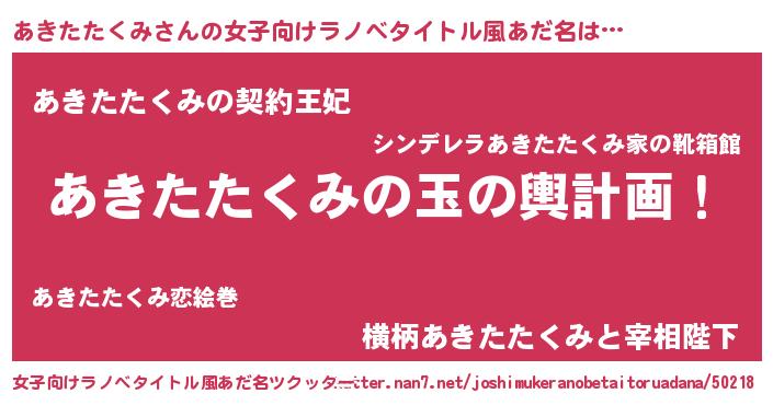 | 男性向けラノベタイトル風あだ名 | 『転生したらあきたたくみだった件』 |