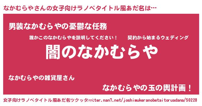 | 男性向けラノベタイトル風あだ名 | 『Re:なかむらやから始める異世界生活』 |