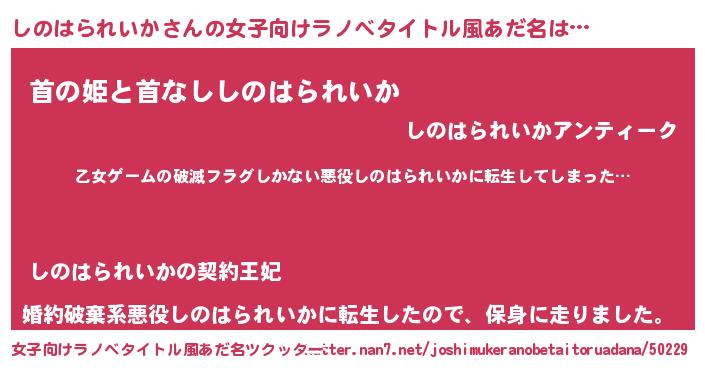 | 男性向けラノベタイトル風あだ名 | 『この素晴らしい世界にしのはられいかを!』 |