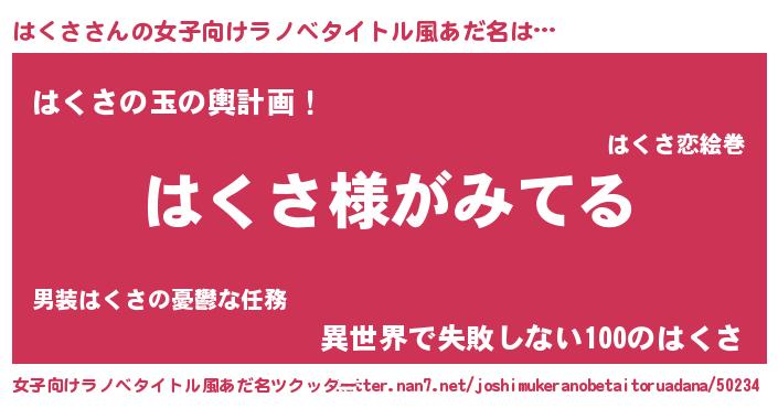 | 男性向けラノベタイトル風あだ名 | 『はくさの嫁は女の子じゃないと思った?』 |