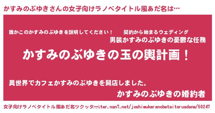 | 男性向けラノベタイトル風あだ名 | 『かすみのぶゆき~年齢イコール彼女いない歴の魔法使い~』 |