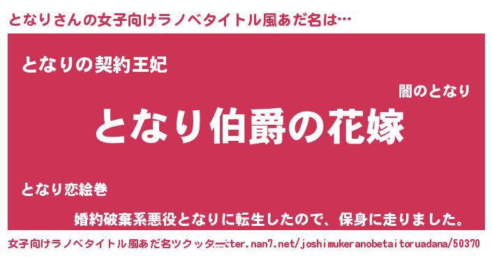 | 男性向けラノベタイトル風あだ名 | 『うちの娘の為ならば、俺はもしかしたらとなりも倒せるかもしれない。』 |