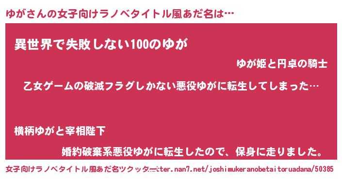 | 男性向けラノベタイトル風あだ名 | 『魔弾の王とゆが』『ユガスレイヤー』 |