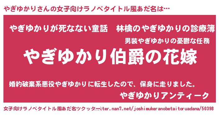| 男性向けラノベタイトル風あだ名 | 『うちの娘の為ならば、俺はもしかしたらやぎゆかりも倒せるかもしれない。』 |