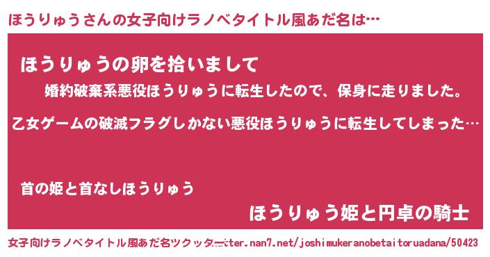 男性向けラノベタイトル風あだ名 | 『この素晴らしい世界にほうりゅうを!』 |