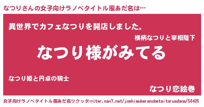 | 男性向けラノベタイトル風あだ名 | 『なつりの嫁は女の子じゃないと思った?』 |