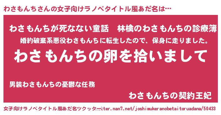 | 男性向けラノベタイトル風あだ名 | 『わさもんちの嫁は女の子じゃないと思った?』 |