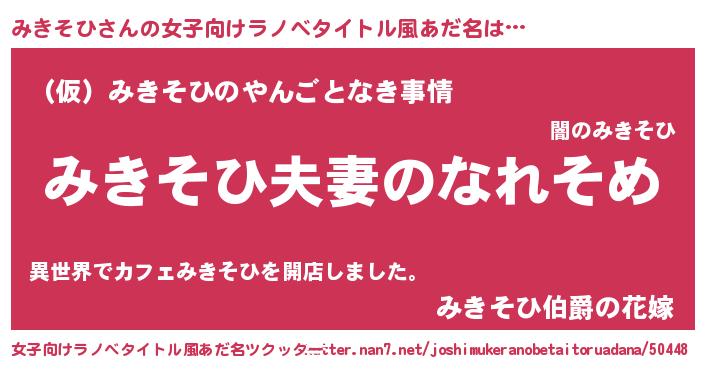 | 男性向けラノベタイトル風あだ名 | 『おまえをオタクにしてやるから、俺をみきそひにしてくれ! 』 |