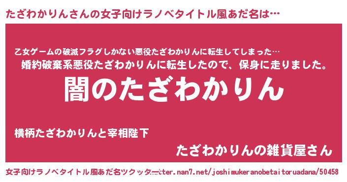 | 男性向けラノベタイトル風あだ名 | 『Re:たざわかりんから始める異世界生活』 |