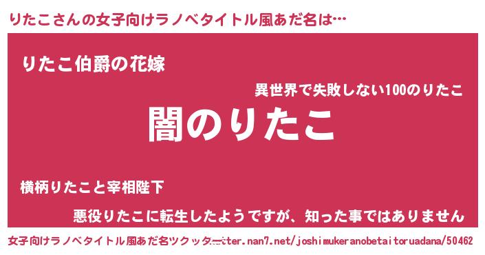 | 男性向けラノベタイトル風あだ名 | 『Re:りたこから始める異世界生活』 |