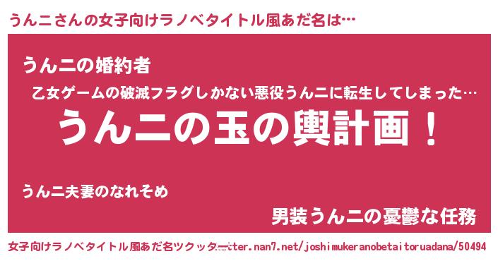 | 男性向けラノベタイトル風あだ名 | 『転生したらうんニだった件』 |