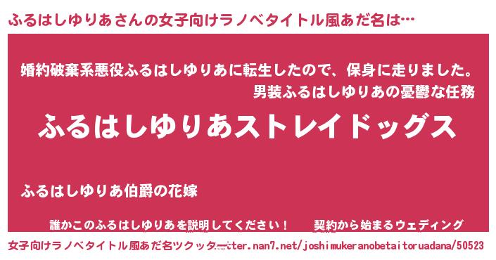 | 男性向けラノベタイトル風あだ名 | 『Re:ふるはしゆりあから始める異世界生活』 |