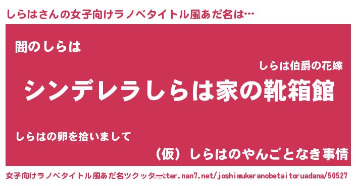 しらはさんの女子向けラノベタイトル風あだ名は… 『シンデレラしらは家の靴箱館』『闇のしらは』『(仮)しらはのやんごとなき事情』 ツクッター #女子向けラノベタイトル風あだ名ツクッター http://tkutter.nan7.net/joshimukeranobetaitoruadana/50527/