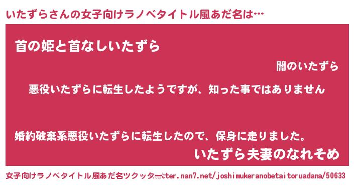 | 男性向けラノベタイトル風あだ名 | 『この素晴らしい世界にいたずらを!』 |