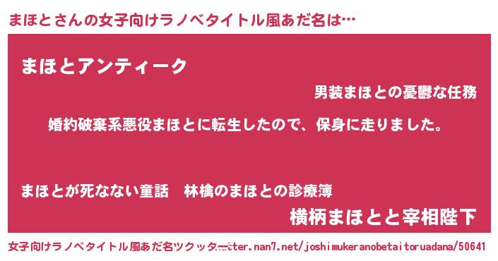 | 男性向けラノベタイトル風あだ名 | 『マホトスレイヤー』『魔弾の王とまほと』 |