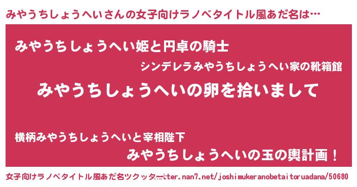 | 男性向けラノベタイトル風あだ名 | 『みやうちしょうへいの嫁は女の子じゃないと思った?』 |