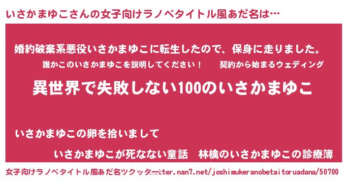 | 男性向けラノベタイトル風あだ名 | 『いさかまゆこという概念が存在しない退屈な世界 』 |
