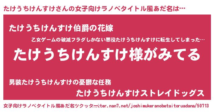 | 男性向けラノベタイトル風あだ名 | 『たけうちけんすけの嫁は女の子じゃないと思った?』 |