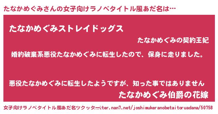 | 男性向けラノベタイトル風あだ名 | 『タナカメグミスレイヤー』 |